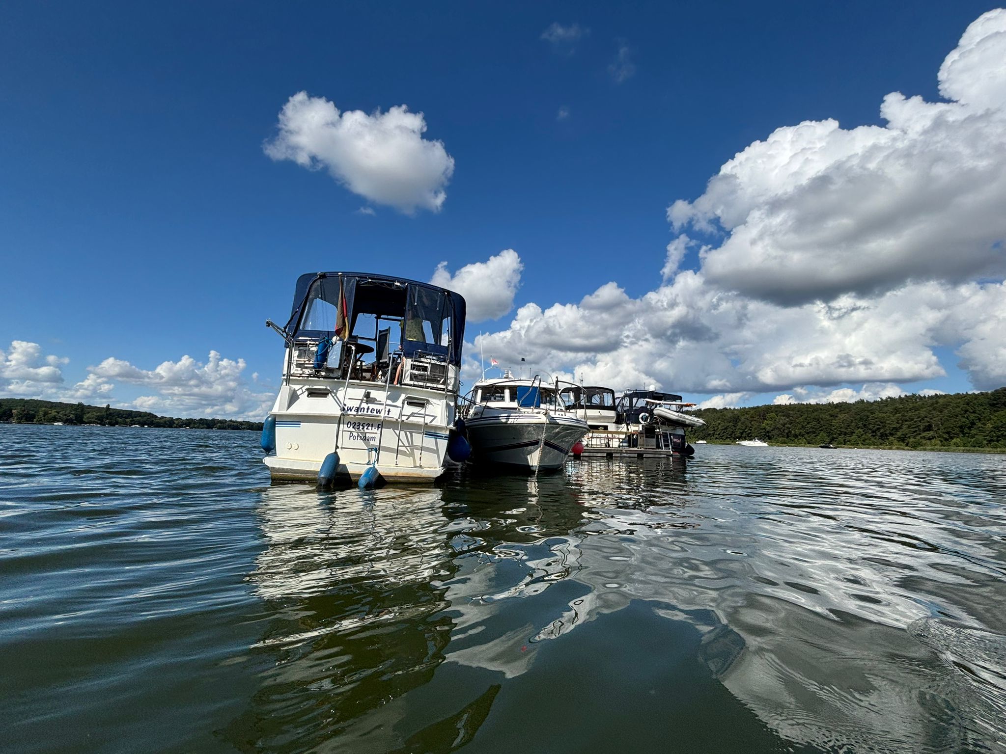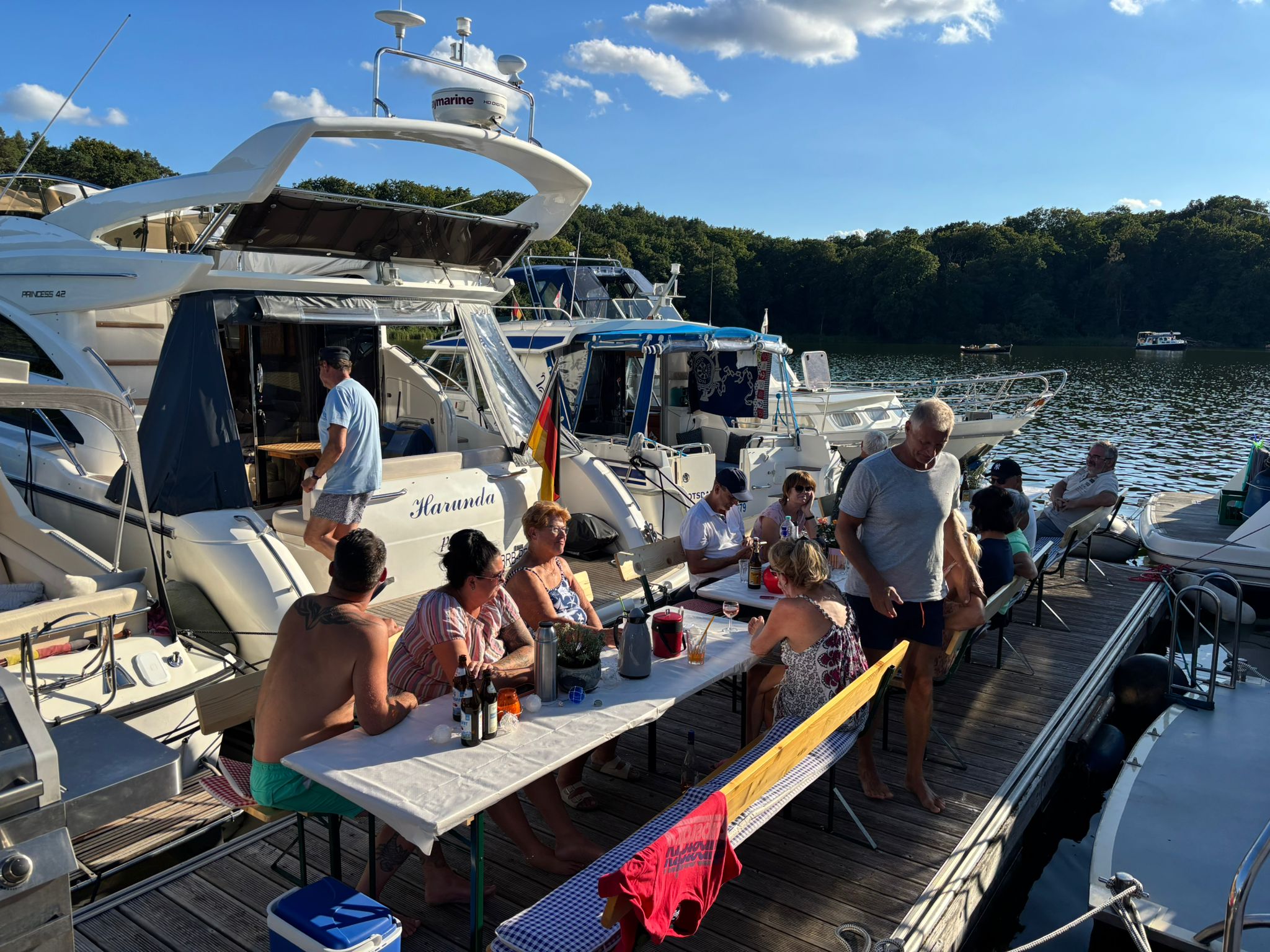 Am ersten Septemberwochenende starte die Bootsabteilung mit 10 Sportbooten + 1 Segelboot ihre jährliche Ausfahrt bei allerbesten sommerlichen Temperaturen. Die gemeinsame Tour der Crews führte mit dem Vereinsponton im Schlepp wieder zum beliebten Krampnitzsee. Dort angekommen gab es erstmal zur „Stärkung“ Kaffee und selbstgebackenen Kuchen. Nach dem Aufbau des Mittelpunkts des Geschehen und dem Sich-Einrichten für die zwei Tage wurde, mit musikalischem Sound aus der Konserve, fröhlich und ausgelassen gefeiert. Natürlich kam das Kulinarische ebenso nicht zu kurz. Es wurde gegrillt und nach Lust und Laune sich den angebotenen Getränken gewidmet. Bei vielen guten Gesprächen, gemütlichem Plaudern und maritimen Klönsnack verbrachte man(n) bis tief in die Nacht eine schöne und vor allem eine schöne gemeinsame Auszeit auf dem Wasser. Der Sonntagmorgen begann mit einem gemeinsamen Frühstück sowie den letzten Vorbereitungen für den Rückweg zum Heimathafen. Allen hatte es gut gefallen und der Wunsch in der nächsten Wassersportsaison erneut einen Bootstörn zu planen, traf auf große Zustimmung. Schade, dass unser neuer Bootsabteilungsleiter nicht von der Partie sein konnte, denn sein sportliches Engagement galt an diesem Wochenende der Teilnahme an den Deutschen Meisterschaften im Kuttersegeln in Goyatz – allerdings mit ein wenig Pech, denn der notwendige Wind in den Segeln blieb aus…