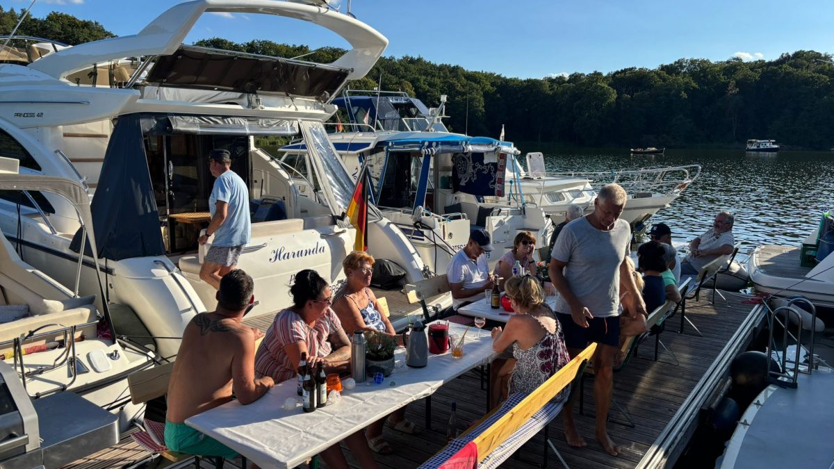 Am ersten Septemberwochenende starte die Bootsabteilung mit 10 Sportbooten + 1 Segelboot ihre jährliche Ausfahrt bei allerbesten sommerlichen Temperaturen. Die gemeinsame Tour der Crews führte mit dem Vereinsponton im Schlepp wieder zum beliebten Krampnitzsee. Dort angekommen gab es erstmal zur „Stärkung“ Kaffee und selbstgebackenen Kuchen. Nach dem Aufbau des Mittelpunkts des Geschehen und dem Sich-Einrichten für die zwei Tage wurde, mit musikalischem Sound aus der Konserve, fröhlich und ausgelassen gefeiert. Natürlich kam das Kulinarische ebenso nicht zu kurz. Es wurde gegrillt und nach Lust und Laune sich den angebotenen Getränken gewidmet. Bei vielen guten Gesprächen, gemütlichem Plaudern und maritimen Klönsnack verbrachte man(n) bis tief in die Nacht eine schöne und vor allem eine schöne gemeinsame Auszeit auf dem Wasser. Der Sonntagmorgen begann mit einem gemeinsamen Frühstück sowie den letzten Vorbereitungen für den Rückweg zum Heimathafen. Allen hatte es gut gefallen und der Wunsch in der nächsten Wassersportsaison erneut einen Bootstörn zu planen, traf auf große Zustimmung. Schade, dass unser neuer Bootsabteilungsleiter nicht von der Partie sein konnte, denn sein sportliches Engagement galt an diesem Wochenende der Teilnahme an den Deutschen Meisterschaften im Kuttersegeln in Goyatz – allerdings mit ein wenig Pech, denn der notwendige Wind in den Segeln blieb aus…